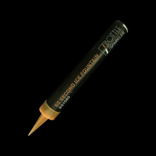 2 cases of 480 (960 x units) gold flamed 60 second Ice Fountain Bottle Sparkler. Black design with orange plastic cake pincer already fitted and supplied. This product conforms to European standards EN 14035-15.