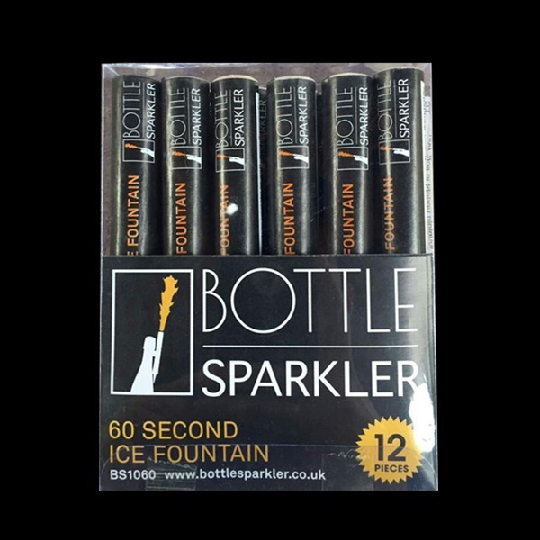 1 case of 480 (40 boxes of 12) gold flamed 60 second Ice Fountain Bottle Sparkler. Black design with orange plastic cake pincer already fitted and supplied. This product conforms to European standards EN 14035-15.